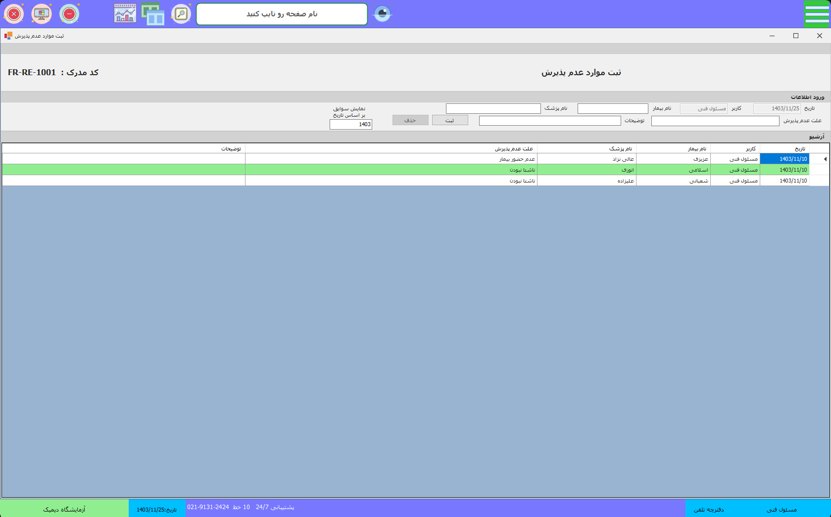 - مدیریت : ثبت موارد عدم پذیرش