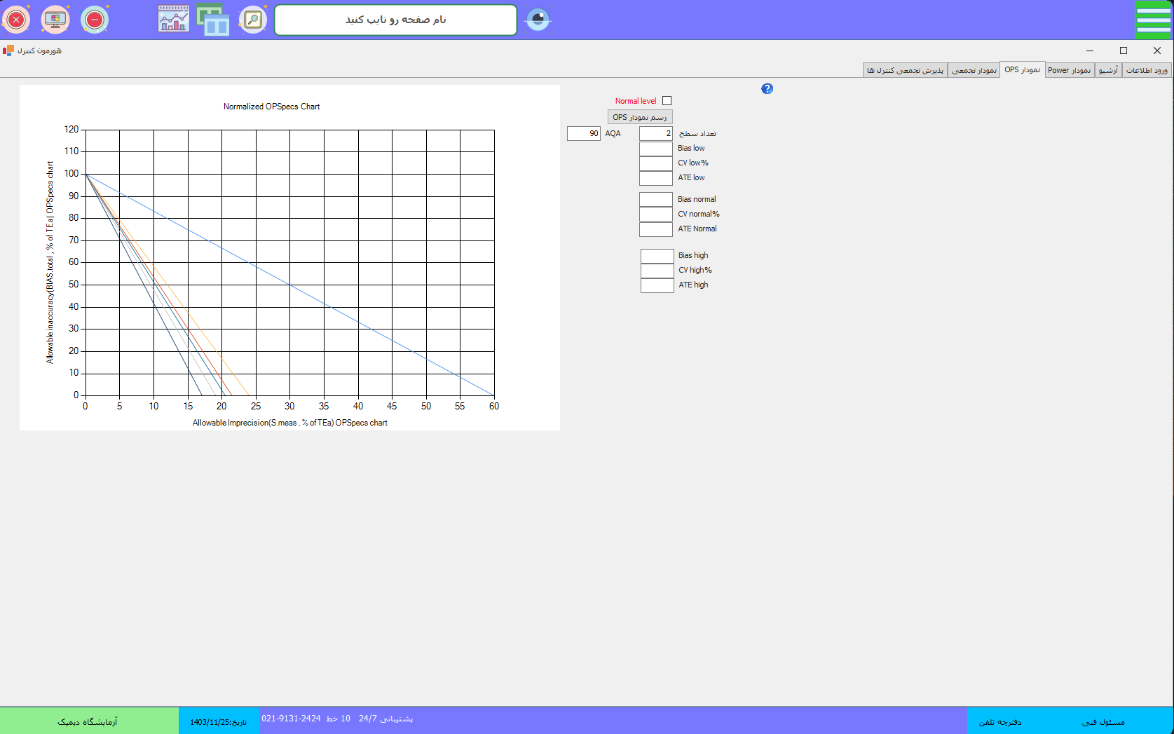 منوی جامع کنترل کیفیت این نرم افزار دارای بخش های متنوع جهت دردسترس بودن و کاربر پسند بودن طراحی شده است . در بخش کنترل کیفیت روزانه بخش ها، شما میتوانید عیار سیگما ، مقایسه خطای مجاز آزمایشگاه خود و خطای مجاز قابل قبول ، مقایسه خطای کل مجاز و خطای کل مجاز قابل قبول و خطای سیستماتیک و تصادفی سنجش های خود را محاسبه و مشاهده کنید.