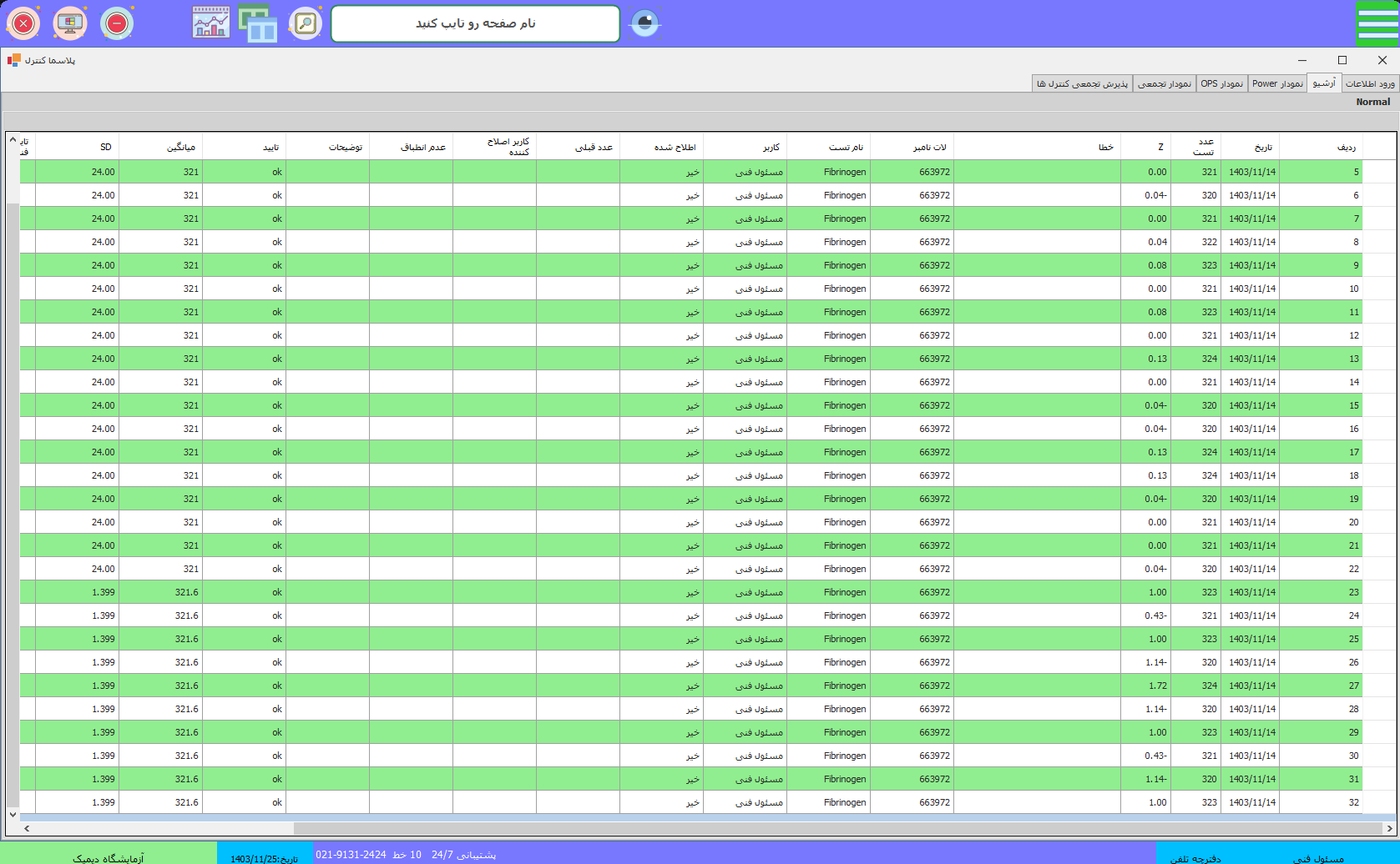 در پارت دوم آموزش ما کنترل کیفیت روزانه در بخش های هماتولوژی ، بیوشیمی، هورمون و انعقاد را خواهیم داشت. کنترل کیفیت روزانه شامل خون کنترل هماتولوژی، سرم کنترل بیوشیمی، سرم کنترل هورمون و انعقاد پلاسما کنترل می باشد. از صفحه ی سرم کنترل بیوشیمی وارد شده و روی ایجاد صفحه ی جدید کلیک میکنیم. نام دستگاه ، نام آزمایش، انتخاب سطح کنترل ، بیست داده ی اول و نام ویال را وارد میکنیم. در مرحله ی بعد اطلاعات سطح نرمال را از داخل بروشور کیت وارد میکنیم. لطفا اطلاعات تاریخ انقضا، لات نامبر، میانگین، mini norm ، max norm را وارد میکنیم و در نهایت نرم فزار میزان SD را برای ما محاسبه خواهد کرد. در نهایت اطلاعات خود را ذخیره خواهیم کرد. به منظور رفرش شدن صفحه ، صفحه را یه بار بسته و مجددا باز میکنیم . از فیلتر نام دستگاه ، دستگاه مربوطه را انتخاب میکنیم و از فیلتر نام تست، تست مربوطه را انتخاب میکنیم. بیست دیتای اول خود را در سمت چپ صفحه وارد میکنیم . بعد از پایان اطلاعات وارد شده ، اطلاعات آزمایشگاه شامل مینگین، SD ، CV آزمایشگاه و CV مجاز تست ، Bias، سیگما و دیگر اطلاعات قابل مشاهده خواهد بود. شما در صفحه آرشیو، اطلاعات بایگانی شده ی خود را میتوانید مشاهده کنید. اطلاعاتی که دارای خطا هستند از این قسمت قابلیت اصلاح را دارند. نمودارهای مختلفی مانند power ، ops و تجمعی نیز برای شما رسم خواهد شد. شما به قبلیت هایی مانند تایید مسیول فنی، چاپ صفحات، حذف صفحه ، تصحیح صفحه نیز دسترسی خواهید داشت.